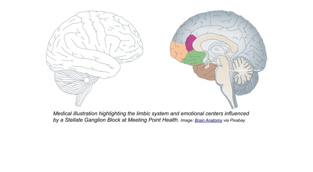 The stellate ganglion has strong connections to important brain areas like the cerebral cortex, hypothalamus, amygdala, and hippocampus. By performing a stellate ganglion block, the procedure can influence the hypothalamus as a central hub. This helps regulate multiple body systems, including: